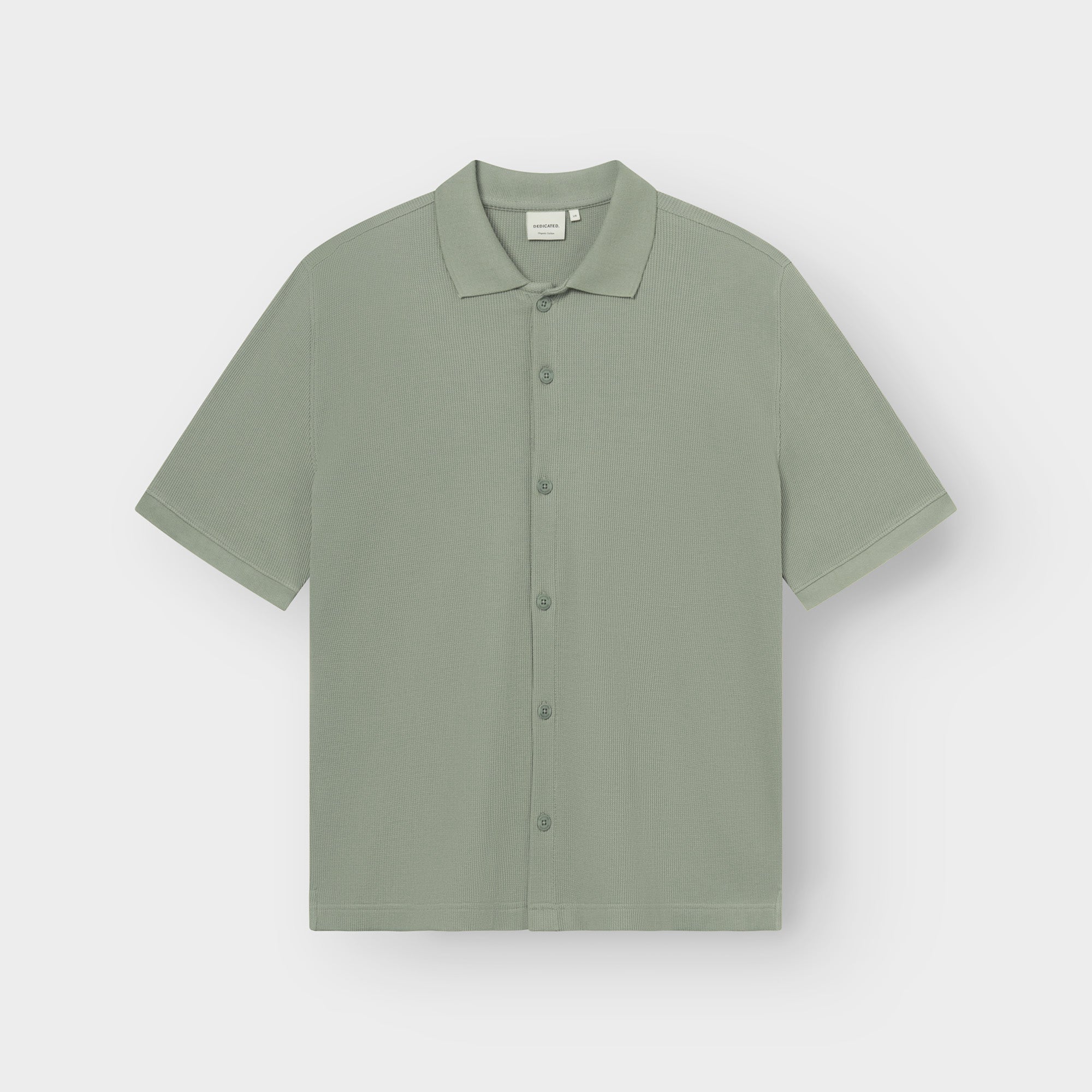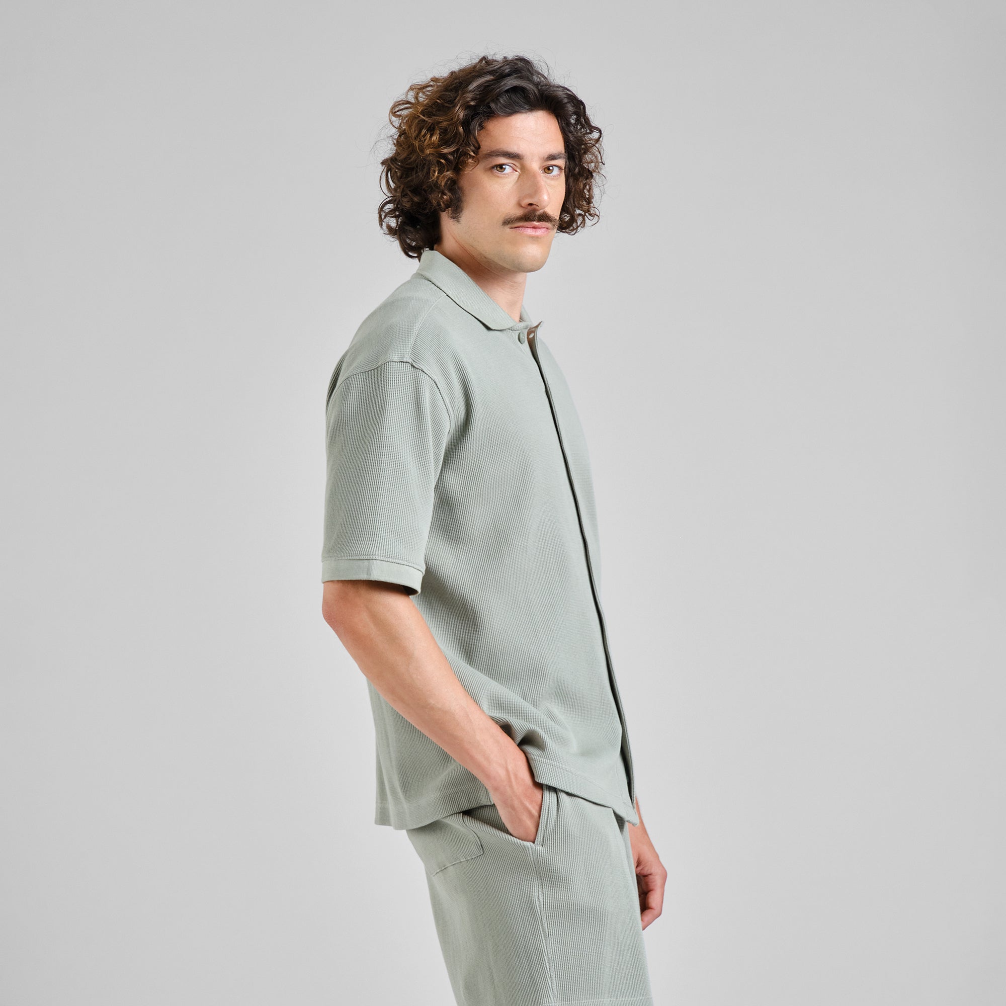 Dieses kurzärmelige Strickhemd hat eine lockere Passform, einen geraden Saum und eine Knopfleiste. Der eisberggrüne Farbton sorgt für einen ruhigen, lässigen Look. Die Waffelstrickstruktur verleiht dem Hemd eine leichte Struktur, während die Rippbündchen für einen sauberen Sitz sorgen. Es ist aus Bio-Baumwolle mit etwas Stretchanteil gefertigt und GOTS- sowie Fairtrade-zertifiziert. Tragen Sie es offen über einem weißen T-Shirt mit den passenden Shorts oder kombinieren Sie es mit Chinos und schlichten Sneakers. – 95 % Bio-Baumwolle, 5 % Elastan; GOTS- und Fairtrade-zertifiziert – Lockere Passform mit kastenförmigem Fall – Kurze Ärmel, Knopfleiste, gerader Saum – 1x1-Rippstrick an Kragen und Ärmelbündchen – Corozo-Knöpfe; Waffelstrickstruktur