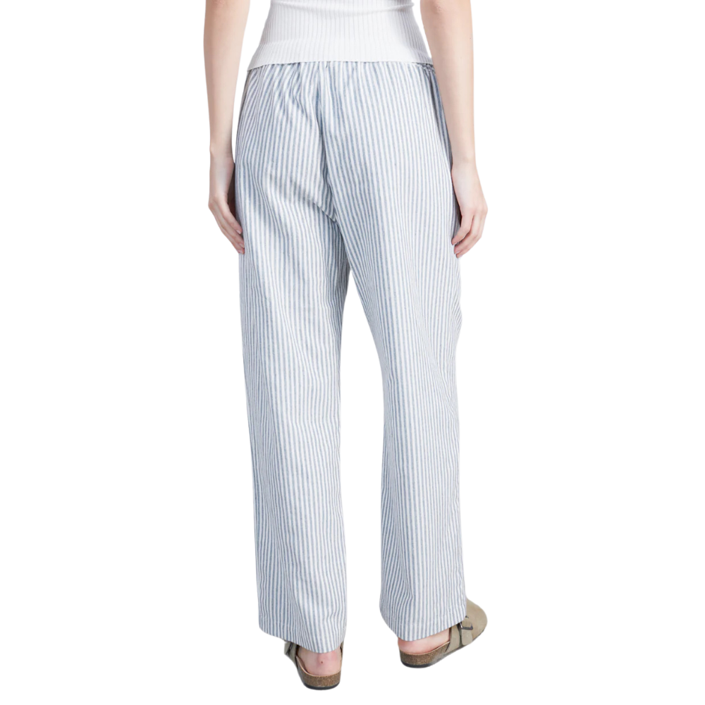 Diese stilvolle Hose mit dezentem Streifenmuster vereint Komfort und Eleganz. Das elastische Bündchen sorgt für eine optimale Passform, während die hochwertige Materialmischung aus Leinen, Baumwolle und Polyester ein angenehmes Tragegefühl bietet.